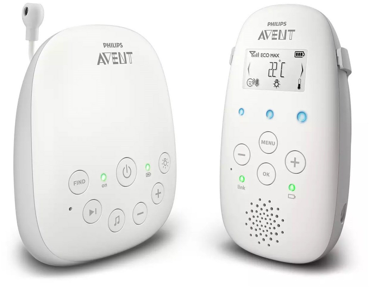 Drei Geräuschpegelanzeigen zum Anzeigen des Geräuschpegels im Zimmer Ihres Babys, auch wenn die Elterneinheit stumm geschaltet ist. Mit der Verbindungsanzeige wissen Sie immer, wann Ihr Babyphone sich in Reichweite befindet und verbunden ist. Die Elterneinheit benachrichtigt Sie, wenn das Babyphone außer Reichweite oder der Akku schwach ist, sodass Sie sicher sein können, dass Sie immer mit Ihrem Baby verbunden sind.